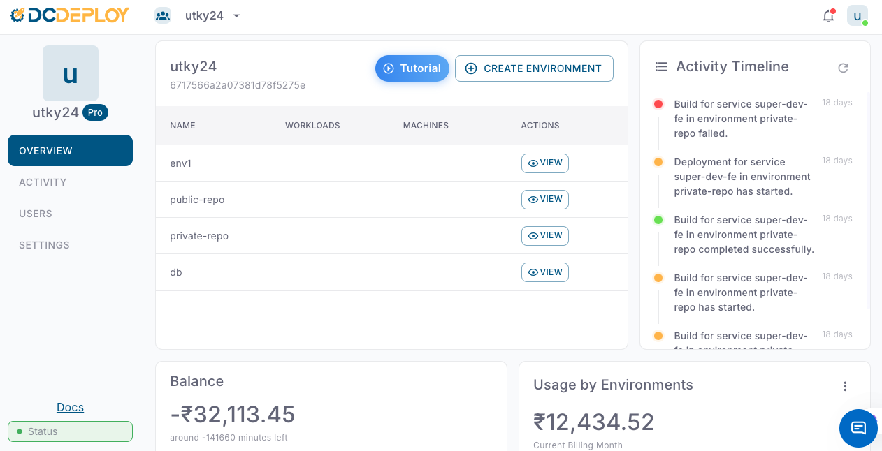 A default organization will be created for you. All the activities, environments, billing and more is present in the dashboard.