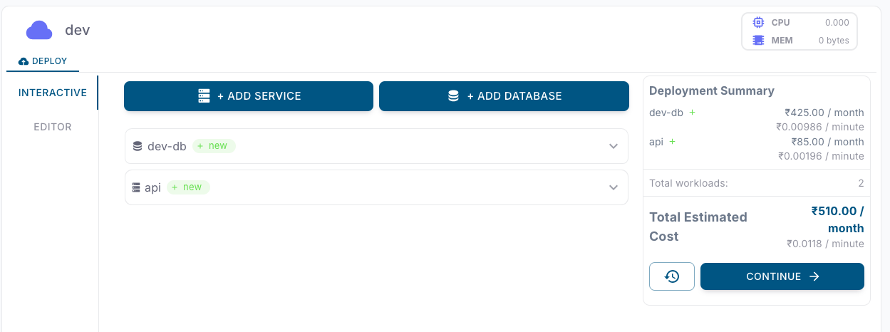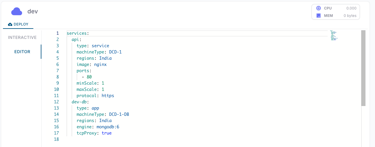 For advance users, a yaml editor is also available to deploy services and databases in a single click.